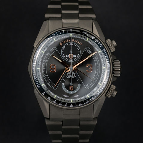 Between modernity and tradition, the Stella Veloce subtly evokes the world of classic cars, while keeping a nod to Bohen's connection with diving, since the crown and pushers are screwed. The dial is impressively visible, thanks to the sapphire crystal that extends over almost the entire case. Its construction is complex: two superimposed dials and two chapter rings, the second chapter ring belongs to the fixed bezel (this is unprecedented). The movement, originally from Swiss manufacturer Lajoux-Peret, is entirely reworked by subcontractors of fine watchmaking in order to obtain its quintessence. It is the subject of the greatest attention: blue screws, blue column wheel, perlages, rose gold details, Côtes de Genève known as "rayons de la gloire", lignes tirées. A work of art to the point that for the first time, Bohen opted for a transparent case back.